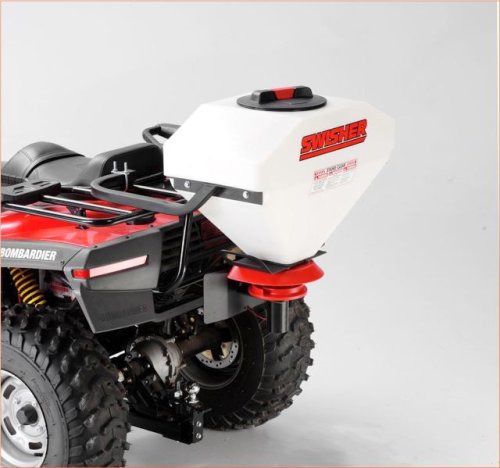 Swisher ATV 15-Gallon Spreader Spread grass seed, fertilizer, salt or sand easily and evenly with the Swisher ATV Spreader: Adjustable spread widths from 4' to 16' in diameter; Heavy duty double ball bearing motor; Universal fit mounts easily to all makes of ATVs; Clear poly tank 15 gallon hopper allows for easy visual of contents; 150-lb. capacity.; Get yours now! Swisher ATV 15-Gallon Spreader